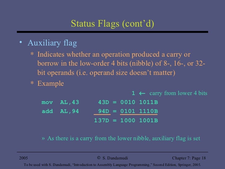 18. 18. Status Flags (cont’d) <ul><li>Auxiliary flag </li></ul><ul><ul><li>Indicates whether an operation produced a carry or borrow in the low-order 4 bits (nibble) of 8-, 16-, or 32-bit operands (i.e. operand size doesn’t matter) </li></ul></ul><ul><ul><li>Example </li></ul></ul><ul><ul><ul><li>1  carry from lower 4 bits </li></ul></ul></ul><ul><ul><ul><li>mov AL,43 43D = 0010 1011B </li></ul></ul></ul><ul><ul><ul><li>add AL,94 94D = 0101 1110B </li></ul></ul></ul><ul><ul><ul><li>137D = 1000 1001B </li></ul></ul></ul><ul><ul><ul><li>As there is a carry from the lower nibble, auxiliary flag is set </li></ul></ul></ul>