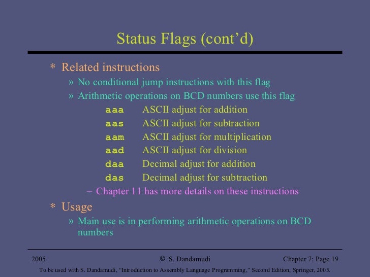 19. 19. Status Flags (cont’d) <ul><ul><li>Related instructions </li></ul></ul><ul><ul><ul><li>No conditional jump instructions with this flag </li></ul></ul></ul><ul><ul><ul><li>Arithmetic operations on BCD numbers use this flag </li></ul></ul></ul><ul><ul><ul><ul><ul><li>aaa ASCII adjust for addition </li></ul></ul></ul></ul></ul><ul><ul><ul><ul><ul><li>aas ASCII adjust for subtraction </li></ul></ul></ul></ul></ul><ul><ul><ul><ul><ul><li>aam ASCII adjust for multiplication </li></ul></ul></ul></ul></ul><ul><ul><ul><ul><ul><li>aad ASCII adjust for division </li></ul></ul></ul></ul></ul><ul><ul><ul><ul><ul><li>daa Decimal adjust for addition </li></ul></ul></ul></ul></ul><ul><ul><ul><ul><ul><li>das Decimal adjust for subtraction </li></ul></ul></ul></ul></ul><ul><ul><ul><ul><li>Chapter 11 has more details on these instructions </li></ul></ul></ul></ul><ul><ul><li>Usage </li></ul></ul><ul><ul><ul><li>Main use is in performing arithmetic operations on BCD numbers </li></ul></ul></ul>