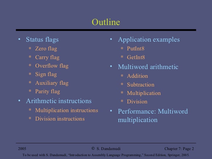 2. 2. Outline <ul><li>Status flags </li></ul><ul><ul><li>Zero flag </li></ul></ul><ul><ul><li>Carry flag </li></ul></ul><ul><ul><li>Overflow flag </li></ul></ul><ul><ul><li>Sign flag </li></ul></ul><ul><ul><li>Auxiliary flag </li></ul></ul><ul><ul><li>Parity flag </li></ul></ul><ul><li>Arithmetic instructions </li></ul><ul><ul><li>Multiplication instructions </li></ul></ul><ul><ul><li>Division instructions </li></ul></ul><ul><li>Application examples </li></ul><ul><ul><li>PutInt8 </li></ul></ul><ul><ul><li>GetInt8 </li></ul></ul><ul><li>Multiword arithmetic </li></ul><ul><ul><li>Addition </li></ul></ul><ul><ul><li>Subtraction </li></ul></ul><ul><ul><li>Multiplication </li></ul></ul><ul><ul><li>Division </li></ul></ul><ul><li>Performance: Multiword multiplication </li></ul>