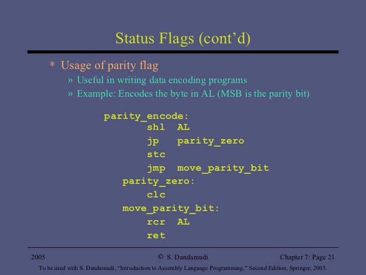 21. 21. Status Flags (cont’d) <ul><ul><li>Usage of parity flag </li></ul></ul><ul><ul><ul><li>Useful in writing data encoding programs </li></ul></ul></ul><ul><ul><ul><li>Example: Encodes the byte in AL (MSB is the parity bit) </li></ul></ul></ul><ul><ul><ul><ul><ul><li>parity_encode: </li></ul></ul></ul></ul></ul><ul><ul><ul><ul><ul><li>shl AL </li></ul></ul></ul></ul></ul><ul><ul><ul><ul><ul><li>jp parity_zero </li></ul></ul></ul></ul></ul><ul><ul><ul><ul><ul><li>stc </li></ul></ul></ul></ul></ul><ul><ul><ul><ul><ul><li>jmp move_parity_bit </li></ul></ul></ul></ul></ul><ul><ul><ul><ul><ul><li>parity_zero: </li></ul></ul></ul></ul></ul><ul><ul><ul><ul><ul><li>clc </li></ul></ul></ul></ul></ul><ul><ul><ul><ul><ul><li>move_parity_bit: </li></ul></ul></ul></ul></ul><ul><ul><ul><ul><ul><li>rcr AL </li></ul></ul></ul></ul></ul><ul><ul><ul><ul><ul><li> ret </li></ul></ul></ul></ul></ul>