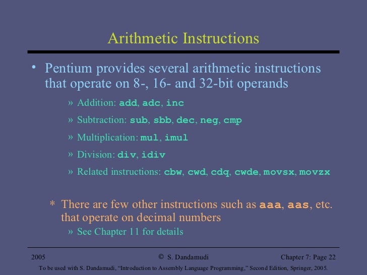 22. 22. Arithmetic Instructions <ul><li>Pentium provides several arithmetic instructions that operate on 8-, 16- and 32-bit operands </li></ul><ul><ul><ul><li>Addition: add , adc , inc </li></ul></ul></ul><ul><ul><ul><li>Subtraction: sub , sbb , dec , neg , cmp </li></ul></ul></ul><ul><ul><ul><li>Multiplication: mul , imul </li></ul></ul></ul><ul><ul><ul><li>Division: div , idiv </li></ul></ul></ul><ul><ul><ul><li>Related instructions: cbw , cwd , cdq , cwde , movsx , movzx </li></ul></ul></ul><ul><ul><li>There are few other instructions such as aaa , aas , etc. that operate on decimal numbers </li></ul></ul><ul><ul><ul><li>See Chapter 11 for details </li></ul></ul></ul>