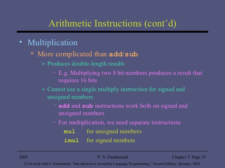 23. 23. Arithmetic Instructions (cont’d) <ul><li>Multiplication </li></ul><ul><ul><li>More complicated than add / sub </li></ul></ul><ul><ul><ul><li>Produces double-length results </li></ul></ul></ul><ul><ul><ul><ul><li>E.g. Multiplying two 8 bit numbers produces a result that requires 16 bits </li></ul></ul></ul></ul><ul><ul><ul><li>Cannot use a single multiply instruction for signed and unsigned numbers </li></ul></ul></ul><ul><ul><ul><ul><li>add and sub instructions work both on signed and unsigned numbers </li></ul></ul></ul></ul><ul><ul><ul><ul><li>For multiplication, we need separate instructions </li></ul></ul></ul></ul><ul><ul><ul><ul><ul><li>mul for unsigned numbers </li></ul></ul></ul></ul></ul><ul><ul><ul><ul><ul><li>imul for signed numbers </li></ul></ul></ul></ul></ul>