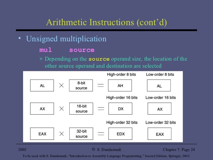 24. 24. Arithmetic Instructions (cont’d) <ul><li>Unsigned multiplication </li></ul><ul><ul><ul><li>mul source </li></ul></ul></ul><ul><ul><ul><li>Depending on the source operand size, the location of the other source operand and destination are selected </li></ul></ul></ul>