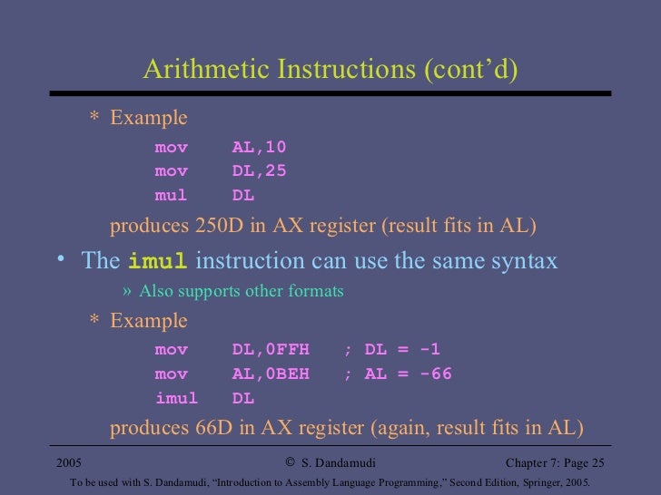 25. 25. Arithmetic Instructions (cont’d) <ul><ul><li>Example </li></ul></ul><ul><ul><ul><ul><li>mov AL,10 </li></ul></ul></ul></ul><ul><ul><ul><ul><li>mov DL,25 </li></ul></ul></ul></ul><ul><ul><ul><ul><li>mul DL </li></ul></ul></ul></ul><ul><ul><li>produces 250D in AX register (result fits in AL) </li></ul></ul><ul><li>The imul instruction can use the same syntax </li></ul><ul><ul><ul><li>Also supports other formats </li></ul></ul></ul><ul><ul><li>Example </li></ul></ul><ul><ul><ul><ul><li>mov DL,0FFH ; DL = -1 </li></ul></ul></ul></ul><ul><ul><ul><ul><li>mov AL,0BEH ; AL = -66 </li></ul></ul></ul></ul><ul><ul><ul><ul><li>imul DL </li></ul></ul></ul></ul><ul><ul><li>produces 66D in AX register (again, result fits in AL) </li></ul></ul>