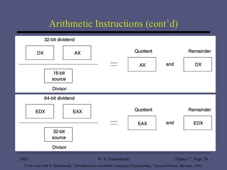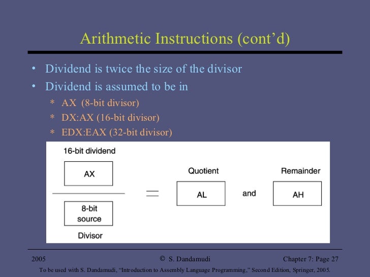 27. 27. Arithmetic Instructions (cont’d) <ul><li>Dividend is twice the size of the divisor </li></ul><ul><li>Dividend is assumed to be in </li></ul><ul><ul><li>AX (8-bit divisor) </li></ul></ul><ul><ul><li>DX:AX (16-bit divisor) </li></ul></ul><ul><ul><li>EDX:EAX (32-bit divisor) </li></ul></ul>
