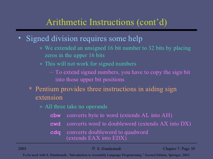 30. 30. Arithmetic Instructions (cont’d) <ul><li>Signed division requires some help </li></ul><ul><ul><ul><li>We extended an unsigned 16 bit number to 32 bits by placing zeros in the upper 16 bits </li></ul></ul></ul><ul><ul><ul><li>This will not work for signed numbers </li></ul></ul></ul><ul><ul><ul><ul><li>To extend signed numbers, you have to copy the sign bit into those upper bit positions </li></ul></ul></ul></ul><ul><ul><li>Pentium provides three instructions in aiding sign extension </li></ul></ul><ul><ul><ul><li>All three take no operands </li></ul></ul></ul><ul><ul><ul><ul><li>cbw converts byte to word (extends AL into AH) </li></ul></ul></ul></ul><ul><ul><ul><ul><li>cwd converts word to doubleword (extends AX into DX) </li></ul></ul></ul></ul><ul><ul><ul><ul><li>cdq converts doubleword to quadword </li></ul></ul></ul></ul><ul><ul><ul><ul><li>(extends EAX into EDX) </li></ul></ul></ul></ul>