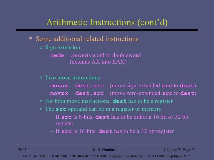 31. 31. Arithmetic Instructions (cont’d) <ul><ul><li>Some additional related instructions </li></ul></ul><ul><ul><ul><li>Sign extension </li></ul></ul></ul><ul><ul><ul><ul><li>cwde converts word to doubleword </li></ul></ul></ul></ul><ul><ul><ul><ul><li>(extends AX into EAX) </li></ul></ul></ul></ul><ul><ul><ul><li>Two move instructions </li></ul></ul></ul><ul><ul><ul><ul><li>movsx dest,src (move sign-extended src to dest ) </li></ul></ul></ul></ul><ul><ul><ul><ul><li>movzx dest,src (move zero-extended src to dest ) </li></ul></ul></ul></ul><ul><ul><ul><li>For both move instructions, dest has to be a register </li></ul></ul></ul><ul><ul><ul><li>The src operand can be in a register or memory </li></ul></ul></ul><ul><ul><ul><ul><li>If src is 8-bits, dest has to be either a 16 bit or 32 bit register </li></ul></ul></ul></ul><ul><ul><ul><ul><li>If src is 16-bits, dest has to be a 32 bit register </li></ul></ul></ul></ul>