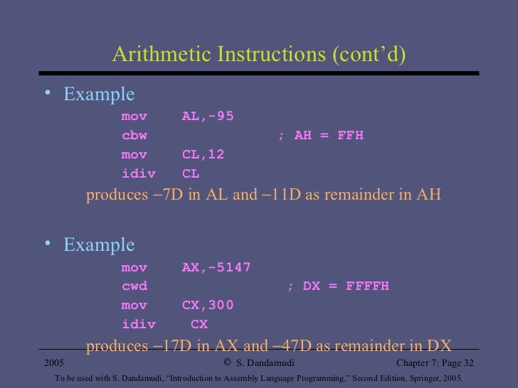 32. 32. Arithmetic Instructions (cont’d) <ul><li>Example </li></ul><ul><ul><ul><ul><li>mov AL,-95 </li></ul></ul></ul></ul><ul><ul><ul><ul><li>cbw ; AH = FFH </li></ul></ul></ul></ul><ul><ul><ul><ul><li>mov CL,12 </li></ul></ul></ul></ul><ul><ul><ul><ul><li>idiv CL </li></ul></ul></ul></ul><ul><ul><li>produces  7D in AL and  11D as remainder in AH </li></ul></ul><ul><li>Example </li></ul><ul><ul><ul><ul><li>mov AX,-5147 </li></ul></ul></ul></ul><ul><ul><ul><ul><li>cwd ; DX = FFFFH </li></ul></ul></ul></ul><ul><ul><ul><ul><li>mov CX,300 </li></ul></ul></ul></ul><ul><ul><ul><ul><li>idiv CX </li></ul></ul></ul></ul><ul><ul><li>produces  17D in AX and  47D as remainder in DX </li></ul></ul>