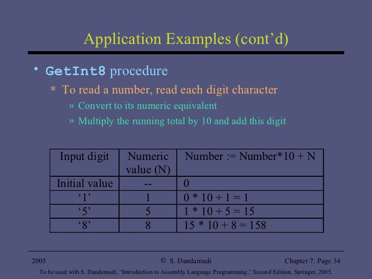 34. 34. Application Examples (cont’d) <ul><li>GetInt8 procedure </li></ul><ul><ul><li>To read a number, read each digit character </li></ul></ul><ul><ul><ul><li>Convert to its numeric equivalent </li></ul></ul></ul><ul><ul><ul><li>Multiply the running total by 10 and add this digit </li></ul></ul></ul>