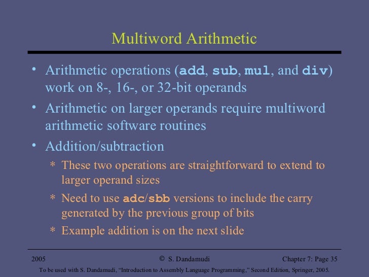 35. 35. Multiword Arithmetic <ul><li>Arithmetic operations ( add , sub , mul , and div ) work on 8-, 16-, or 32-bit operands </li></ul><ul><li>Arithmetic on larger operands require multiword arithmetic software routines </li></ul><ul><li>Addition/subtraction </li></ul><ul><ul><li>These two operations are straightforward to extend to larger operand sizes </li></ul></ul><ul><ul><li>Need to use adc / sbb versions to include the carry generated by the previous group of bits </li></ul></ul><ul><ul><li>Example addition is on the next slide </li></ul></ul>
