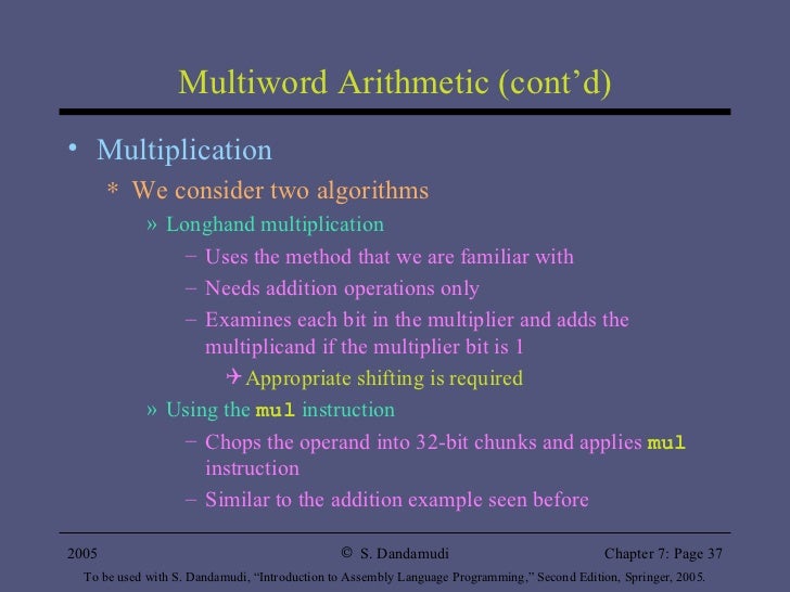 37. 37. Multiword Arithmetic (cont’d) <ul><li>Multiplication </li></ul><ul><ul><li>We consider two algorithms </li></ul></ul><ul><ul><ul><li>Longhand multiplication </li></ul></ul></ul><ul><ul><ul><ul><li>Uses the method that we are familiar with </li></ul></ul></ul></ul><ul><ul><ul><ul><li>Needs addition operations only </li></ul></ul></ul></ul><ul><ul><ul><ul><li>Examines each bit in the multiplier and adds the multiplicand if the multiplier bit is 1 </li></ul></ul></ul></ul><ul><ul><ul><ul><ul><li>Appropriate shifting is required </li></ul></ul></ul></ul></ul><ul><ul><ul><li>Using the mul instruction </li></ul></ul></ul><ul><ul><ul><ul><li>Chops the operand into 32-bit chunks and applies mul instruction </li></ul></ul></ul></ul><ul><ul><ul><ul><li>Similar to the addition example seen before </li></ul></ul></ul></ul>