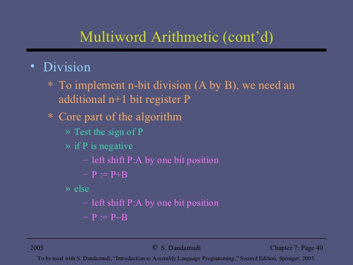 40. 40. Multiword Arithmetic (cont’d) <ul><li>Division </li></ul><ul><ul><li>To implement n-bit division (A by B), we need an additional n+1 bit register P </li></ul></ul><ul><ul><li>Core part of the algorithm </li></ul></ul><ul><ul><ul><li>Test the sign of P </li></ul></ul></ul><ul><ul><ul><li>if P is negative </li></ul></ul></ul><ul><ul><ul><ul><li>left shift P:A by one bit position </li></ul></ul></ul></ul><ul><ul><ul><ul><li>P := P+B </li></ul></ul></ul></ul><ul><ul><ul><li>else </li></ul></ul></ul><ul><ul><ul><ul><li>left shift P:A by one bit position </li></ul></ul></ul></ul><ul><ul><ul><ul><li>P := P  B </li></ul></ul></ul></ul>
