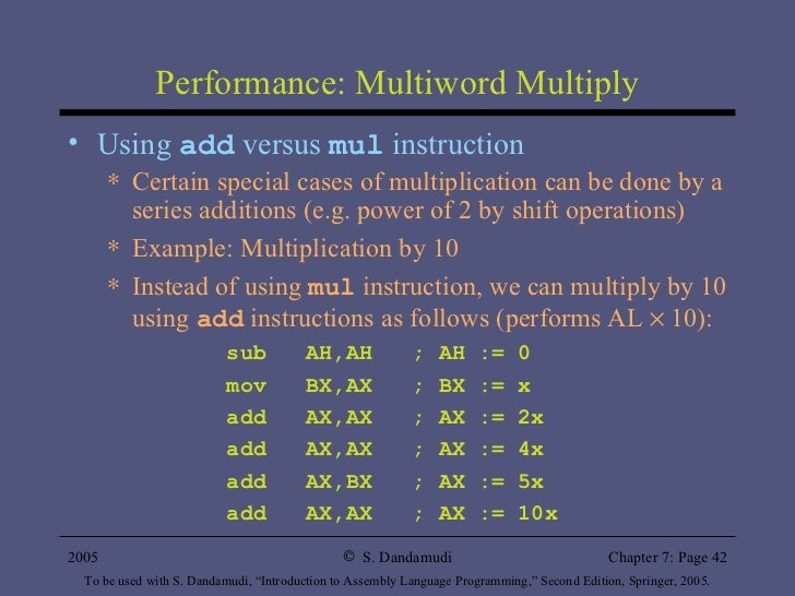 42. 42. Performance: Multiword Multiply <ul><li>Using add versus mul instruction </li></ul><ul><ul><li>Certain special cases of multiplication can be done by a series additions (e.g. power of 2 by shift operations) </li></ul></ul><ul><ul><li>Example: Multiplication by 10 </li></ul></ul><ul><ul><li>Instead of using mul instruction, we can multiply by 10 using add instructions as follows (performs AL  10): </li></ul></ul><ul><ul><ul><ul><ul><li>sub AH,AH ; AH := 0 </li></ul></ul></ul></ul></ul><ul><ul><ul><ul><ul><li>mov BX,AX ; BX := x </li></ul></ul></ul></ul></ul><ul><ul><ul><ul><ul><li>add AX,AX ; AX := 2x </li></ul></ul></ul></ul></ul><ul><ul><ul><ul><ul><li>add AX,AX ; AX := 4x </li></ul></ul></ul></ul></ul><ul><ul><ul><ul><ul><li>add AX,BX ; AX := 5x </li></ul></ul></ul></ul></ul><ul><ul><ul><ul><ul><li>add AX,AX ; AX := 10x </li></ul></ul></ul></ul></ul>