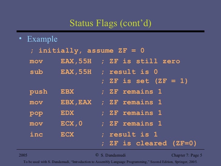 5. 5. Status Flags (cont’d) <ul><li>Example </li></ul><ul><ul><li>; initially, assume ZF = 0 </li></ul></ul><ul><ul><li>mov EAX,55H ; ZF is still zero </li></ul></ul><ul><ul><li>sub EAX,55H ; result is 0 </li></ul></ul><ul><ul><li>; ZF is set (ZF = 1) </li></ul></ul><ul><ul><li>push EBX ; ZF remains 1 </li></ul></ul><ul><ul><li>mov EBX,EAX ; ZF remains 1 </li></ul></ul><ul><ul><li>pop EDX ; ZF remains 1 </li></ul></ul><ul><ul><li>mov ECX,0 ; ZF remains 1 </li></ul></ul><ul><ul><li>inc ECX ; result is 1 </li></ul></ul><ul><ul><li>; ZF is cleared (ZF=0) </li></ul></ul>