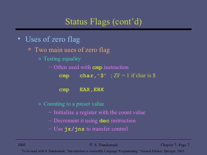 7. 7. Status Flags (cont’d) <ul><li>Uses of zero flag </li></ul><ul><ul><li>Two main uses of zero flag </li></ul></ul><ul><ul><ul><li>Testing equality </li></ul></ul></ul><ul><ul><ul><ul><li>Often used with cmp instruction </li></ul></ul></ul></ul><ul><ul><ul><ul><ul><li>cmp char,’$’ ; ZF = 1 if char is $ </li></ul></ul></ul></ul></ul><ul><ul><ul><ul><ul><li>cmp EAX,EBX </li></ul></ul></ul></ul></ul><ul><ul><ul><li>Counting to a preset value </li></ul></ul></ul><ul><ul><ul><ul><li>Initialize a register with the count value </li></ul></ul></ul></ul><ul><ul><ul><ul><li>Decrement it using dec instruction </li></ul></ul></ul></ul><ul><ul><ul><ul><li>Use jz / jnz to transfer control </li></ul></ul></ul></ul>