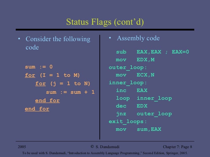 8. 8. Status Flags (cont’d) <ul><li>Consider the following code </li></ul><ul><li>sum := 0 </li></ul><ul><li>for (I = 1 to M) </li></ul><ul><li>for (j = 1 to N) </li></ul><ul><li>sum := sum + 1 </li></ul><ul><li>end for </li></ul><ul><li>end for </li></ul><ul><li>Assembly code </li></ul><ul><li>sub EAX,EAX ; EAX=0 </li></ul><ul><li>mov EDX,M </li></ul><ul><li>outer_loop: </li></ul><ul><li>mov ECX,N </li></ul><ul><li>inner_loop: </li></ul><ul><li>inc EAX </li></ul><ul><li>loop inner_loop </li></ul><ul><li>dec EDX </li></ul><ul><li>jnz outer_loop </li></ul><ul><li>exit_loops: </li></ul><ul><li>mov sum,EAX </li></ul>