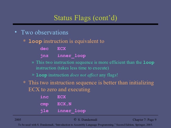 9. 9. Status Flags (cont’d) <ul><li>Two observations </li></ul><ul><ul><li>loop instruction is equivalent to </li></ul></ul><ul><ul><ul><ul><li>dec ECX </li></ul></ul></ul></ul><ul><ul><ul><ul><li>jnz inner_loop </li></ul></ul></ul></ul><ul><ul><ul><li>This two instruction sequence is more efficient than the loop instruction (takes less time to execute) </li></ul></ul></ul><ul><ul><ul><li>loop instruction does not affect any flags! </li></ul></ul></ul><ul><ul><li>This two instruction sequence is better than initializing ECX to zero and executing </li></ul></ul><ul><ul><ul><ul><li>inc ECX </li></ul></ul></ul></ul><ul><ul><ul><ul><li>cmp ECX,N </li></ul></ul></ul></ul><ul><ul><ul><ul><li>jle inner_loop </li></ul></ul></ul></ul>