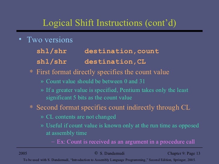 13. 13. Logical Shift Instructions (cont’d) <ul><li>Two versions </li></ul><ul><ul><li>shl/shr destination,count </li></ul></ul><ul><ul><li>shl/shr destination,CL </li></ul></ul><ul><ul><li>First format directly specifies the count value </li></ul></ul><ul><ul><ul><li>Count value should be between 0 and 31 </li></ul></ul></ul><ul><ul><ul><li>If a greater value is specified, Pentium takes only the least significant 5 bits as the count value </li></ul></ul></ul><ul><ul><li>Second format specifies count indirectly through CL </li></ul></ul><ul><ul><ul><li>CL contents are not changed </li></ul></ul></ul><ul><ul><ul><li>Useful if count value is known only at the run time as opposed at assembly time </li></ul></ul></ul><ul><ul><ul><ul><li>Ex: Count is received as an argument in a procedure call </li></ul></ul></ul></ul>