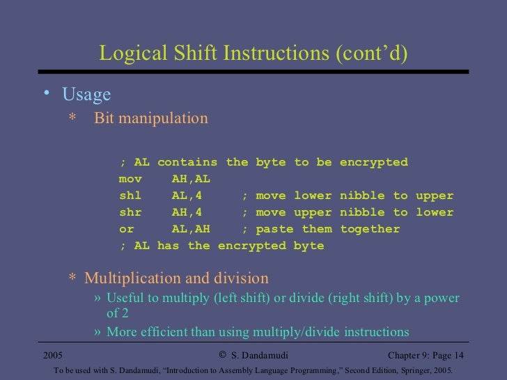 14. 14. Logical Shift Instructions (cont’d) <ul><li>Usage </li></ul><ul><ul><li>Bit manipulation </li></ul></ul><ul><ul><ul><ul><li>; AL contains the byte to be encrypted </li></ul></ul></ul></ul><ul><ul><ul><ul><li>mov AH,AL </li></ul></ul></ul></ul><ul><ul><ul><ul><li>shl AL,4 ; move lower nibble to upper </li></ul></ul></ul></ul><ul><ul><ul><ul><li>shr AH,4 ; move upper nibble to lower </li></ul></ul></ul></ul><ul><ul><ul><ul><li>or AL,AH ; paste them together </li></ul></ul></ul></ul><ul><ul><ul><ul><li>; AL has the encrypted byte </li></ul></ul></ul></ul><ul><ul><li>Multiplication and division </li></ul></ul><ul><ul><ul><li>Useful to multiply (left shift) or divide (right shift) by a power of 2 </li></ul></ul></ul><ul><ul><ul><li>More efficient than using multiply/divide instructions </li></ul></ul></ul>