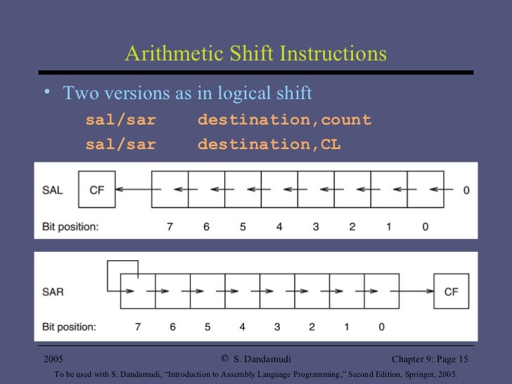 15. 15. Arithmetic Shift Instructions <ul><li>Two versions as in logical shift </li></ul><ul><ul><li>sal/sar destination,count </li></ul></ul><ul><ul><li>sal/sar destination,CL </li></ul></ul>