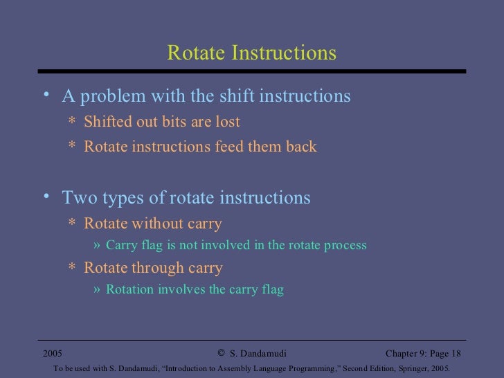 18. 18. Rotate Instructions <ul><li>A problem with the shift instructions </li></ul><ul><ul><li>Shifted out bits are lost </li></ul></ul><ul><ul><li>Rotate instructions feed them back </li></ul></ul><ul><li>Two types of rotate instructions </li></ul><ul><ul><li>Rotate without carry </li></ul></ul><ul><ul><ul><li>Carry flag is not involved in the rotate process </li></ul></ul></ul><ul><ul><li>Rotate through carry </li></ul></ul><ul><ul><ul><li>Rotation involves the carry flag </li></ul></ul></ul>