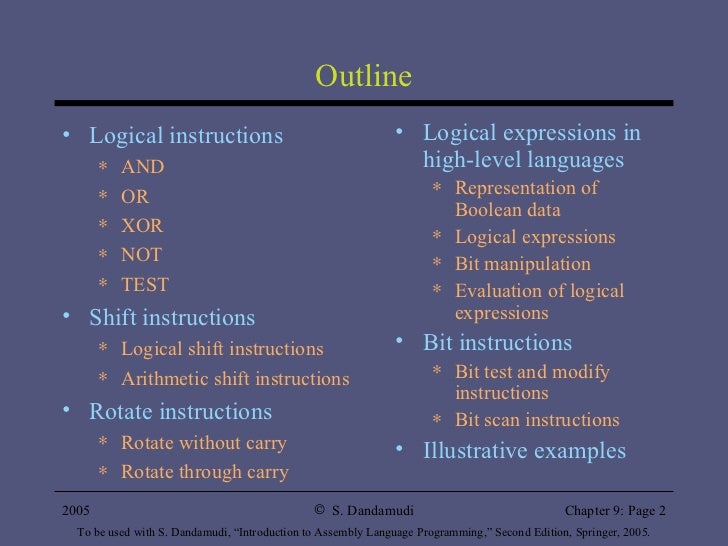 2. 2. Outline <ul><li>Logical instructions </li></ul><ul><ul><li>AND </li></ul></ul><ul><ul><li>OR </li></ul></ul><ul><ul><li>XOR </li></ul></ul><ul><ul><li>NOT </li></ul></ul><ul><ul><li>TEST </li></ul></ul><ul><li>Shift instructions </li></ul><ul><ul><li>Logical shift instructions </li></ul></ul><ul><ul><li>Arithmetic shift instructions </li></ul></ul><ul><li>Rotate instructions </li></ul><ul><ul><li>Rotate without carry </li></ul></ul><ul><ul><li>Rotate through carry </li></ul></ul><ul><li>Logical expressions in high-level languages </li></ul><ul><ul><li>Representation of Boolean data </li></ul></ul><ul><ul><li>Logical expressions </li></ul></ul><ul><ul><li>Bit manipulation </li></ul></ul><ul><ul><li>Evaluation of logical expressions </li></ul></ul><ul><li>Bit instructions </li></ul><ul><ul><li>Bit test and modify instructions </li></ul></ul><ul><ul><li>Bit scan instructions </li></ul></ul><ul><li>Illustrative examples </li></ul>