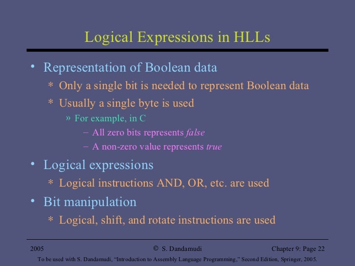 22. 22. Logical Expressions in HLLs <ul><li>Representation of Boolean data </li></ul><ul><ul><li>Only a single bit is needed to represent Boolean data </li></ul></ul><ul><ul><li>Usually a single byte is used </li></ul></ul><ul><ul><ul><li>For example, in C </li></ul></ul></ul><ul><ul><ul><ul><li>All zero bits represents false </li></ul></ul></ul></ul><ul><ul><ul><ul><li>A non-zero value represents true </li></ul></ul></ul></ul><ul><li>Logical expressions </li></ul><ul><ul><li>Logical instructions AND, OR, etc. are used </li></ul></ul><ul><li>Bit manipulation </li></ul><ul><ul><li>Logical, shift, and rotate instructions are used </li></ul></ul>