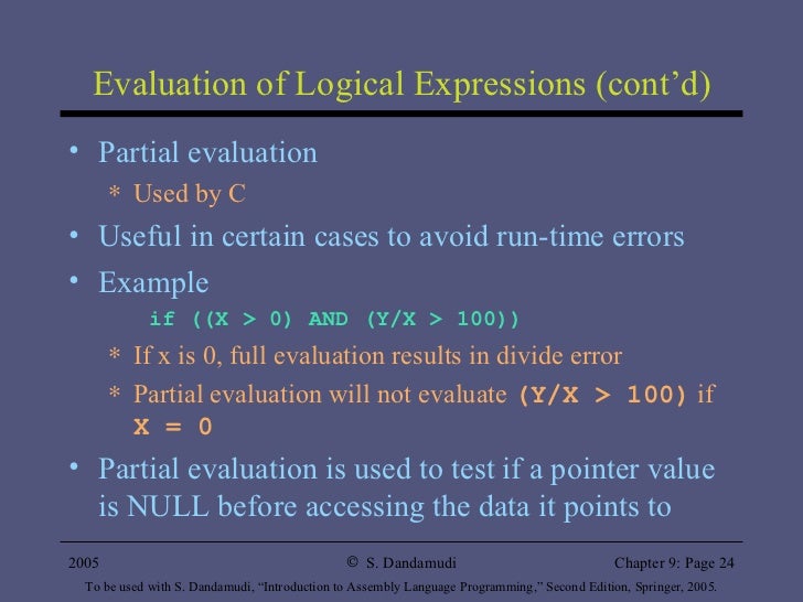 24. 24. Evaluation of Logical Expressions (cont’d) <ul><li>Partial evaluation </li></ul><ul><ul><li>Used by C </li></ul></ul><ul><li>Useful in certain cases to avoid run-time errors </li></ul><ul><li>Example </li></ul><ul><ul><ul><li>if ((X > 0) AND (Y/X > 100)) </li></ul></ul></ul><ul><ul><li>If x is 0, full evaluation results in divide error </li></ul></ul><ul><ul><li>Partial evaluation will not evaluate (Y/X > 100) if X = 0 </li></ul></ul><ul><li>Partial evaluation is used to test if a pointer value is NULL before accessing the data it points to </li></ul>