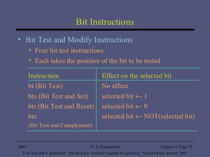 25. 25. Bit Instructions <ul><li>Bit Test and Modify Instructions </li></ul><ul><ul><li>Four bit test instructions </li></ul></ul><ul><ul><li>Each takes the position of the bit to be tested </li></ul></ul><ul><ul><li>Instruction Effect on the selected bit </li></ul></ul><ul><ul><li>bt (Bit Test) No effect </li></ul></ul><ul><ul><li>bts (Bit Test and Set) selected bit  1 </li></ul></ul><ul><ul><li>btr (Bit Test and Reset) selected bit  0 </li></ul></ul><ul><ul><li>btc selected bit  NOT(selected bit) </li></ul></ul><ul><ul><li>(Bit Test and Complement) </li></ul></ul>