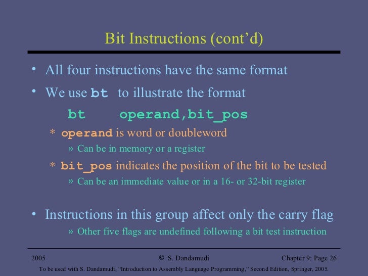 26. 26. Bit Instructions (cont’d) <ul><li>All four instructions have the same format </li></ul><ul><li>We use bt to illustrate the format </li></ul><ul><ul><ul><li>bt operand,bit_pos </li></ul></ul></ul><ul><ul><li>operand is word or doubleword </li></ul></ul><ul><ul><ul><li>Can be in memory or a register </li></ul></ul></ul><ul><ul><li>bit_pos indicates the position of the bit to be tested </li></ul></ul><ul><ul><ul><li>Can be an immediate value or in a 16- or 32-bit register </li></ul></ul></ul><ul><li>Instructions in this group affect only the carry flag </li></ul><ul><ul><ul><li>Other five flags are undefined following a bit test instruction </li></ul></ul></ul>