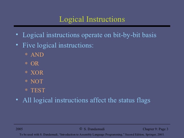3. 3. Logical Instructions <ul><li>Logical instructions operate on bit-by-bit basis </li></ul><ul><li>Five logical instructions: </li></ul><ul><ul><li>AND </li></ul></ul><ul><ul><li>OR </li></ul></ul><ul><ul><li>XOR </li></ul></ul><ul><ul><li>NOT </li></ul></ul><ul><ul><li>TEST </li></ul></ul><ul><li>All logical instructions affect the status flags </li></ul>
