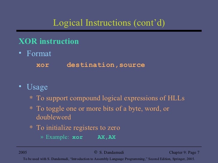 7. 7. Logical Instructions (cont’d) <ul><li>XOR instruction </li></ul><ul><li>Format </li></ul><ul><ul><li>xor destination,source </li></ul></ul><ul><li>Usage </li></ul><ul><ul><li>To support compound logical expressions of HLLs </li></ul></ul><ul><ul><li>To toggle one or more bits of a byte, word, or doubleword </li></ul></ul><ul><ul><li>To initialize registers to zero </li></ul></ul><ul><ul><ul><li>Example: xor AX,AX </li></ul></ul></ul>