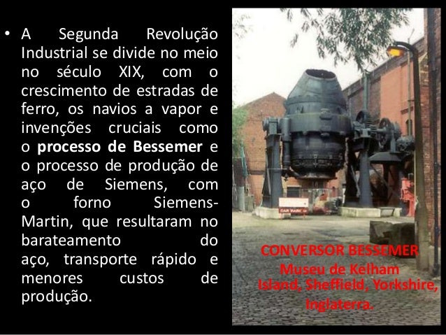 8. 8. • A Segunda Revolução Industrial se divide no meio no século XIX, com o crescimento de estradas de ferro, os navios a vapor e invenções cruciais como o processo de Bessemer e o processo de produção de aço de Siemens, com o forno Siemens- Martin, que resultaram no barateamento do CONVERSOR BESSEMER aço, transporte rápido e Museu de Kelham menores custos de Island, Sheffield, Yorkshire, produção. Inglaterra.