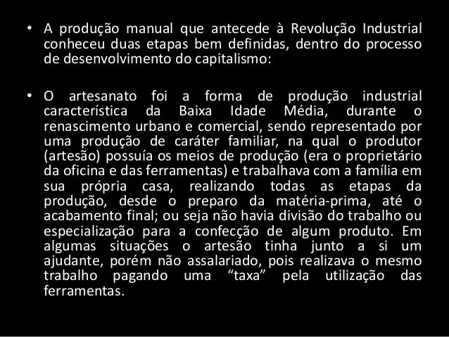 15. 15. • A produção manual que antecede à Revolução Industrial conheceu duas etapas bem definidas, dentro do processo de desenvolvimento do capitalismo:• O artesanato foi a forma de produção industrial característica da Baixa Idade Média, durante o renascimento urbano e comercial, sendo representado por uma produção de caráter familiar, na qual o produtor (artesão) possuía os meios de produção (era o proprietário da oficina e das ferramentas) e trabalhava com a família em sua própria casa, realizando todas as etapas da produção, desde o preparo da matéria-prima, até o acabamento final; ou seja não havia divisão do trabalho ou especialização para a confecção de algum produto. Em algumas situações o artesão tinha junto a si um ajudante, porém não assalariado, pois realizava o mesmo trabalho pagando uma “taxa” pela utilização das ferramentas.