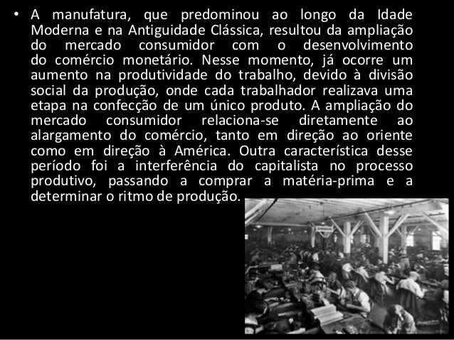 17. 17. • A manufatura, que predominou ao longo da Idade Moderna e na Antiguidade Clássica, resultou da ampliação do mercado consumidor com o desenvolvimento do comércio monetário. Nesse momento, já ocorre um aumento na produtividade do trabalho, devido à divisão social da produção, onde cada trabalhador realizava uma etapa na confecção de um único produto. A ampliação do mercado consumidor relaciona-se diretamente ao alargamento do comércio, tanto em direção ao oriente como em direção à América. Outra característica desse período foi a interferência do capitalista no processo produtivo, passando a comprar a matéria-prima e a determinar o ritmo de produção.