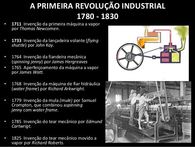 2. 2. A PRIMEIRA REVOLUÇÃO INDUSTRIAL 1780 - 1830• 1711 Invenção da primeira máquina a vapor por Thomas Newcomen.• 1733 Invenção da lançadeira volante (flying shuttle) por John Kay.• 1764 Invenção da fiandeira mecânica (spinning jenny) por James Hergreaves• 1765 Aperfeiçoamento da máquina a vapor por James Watt.• 1768 Invenção da máquina de fiar hidráulica (water frame) por Richard Arkwright.• 1779 Invenção da mula (mule) por Samuel Crompton, que combinou aspinning jenny com water frame.• 1785 Invenção do tear mecânico por Edmund Cartwrigt.• 1825 Invenção do tear mecânico movido a vapor por Richard Roberts.