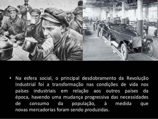 18. 18. • Na esfera social, o principal desdobramento da Revolução Industrial foi a transformação nas condições de vida nos países industriais em relação aos outros países da época, havendo uma mudança progressiva das necessidades de consumo da população, à medida que novas mercadorias foram sendo produzidas.