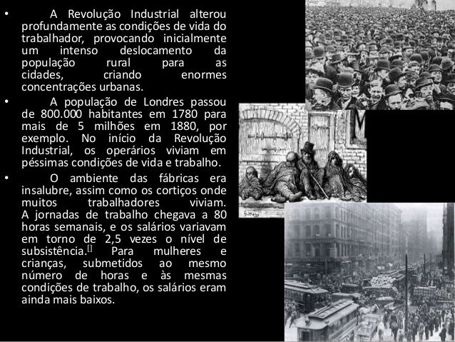 19. 19. • A Revolução Industrial alterou profundamente as condições de vida do trabalhador, provocando inicialmente um intenso deslocamento da população rural para as cidades, criando enormes concentrações urbanas.• A população de Londres passou de 800.000 habitantes em 1780 para mais de 5 milhões em 1880, por exemplo. No início da Revolução Industrial, os operários viviam em péssimas condições de vida e trabalho.• O ambiente das fábricas era insalubre, assim como os cortiços onde muitos trabalhadores viviam. A jornadas de trabalho chegava a 80 horas semanais, e os salários variavam em torno de 2,5 vezes o nível de subsistência.[] Para mulheres e crianças, submetidos ao mesmo número de horas e às mesmas condições de trabalho, os salários eram ainda mais baixos.