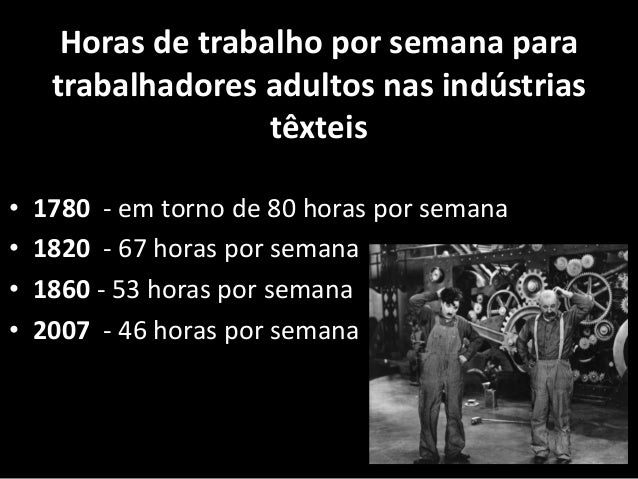 21. 21. Horas de trabalho por semana para trabalhadores adultos nas indústrias têxteis• 1780 - em torno de 80 horas por semana• 1820 - 67 horas por semana• 1860 - 53 horas por semana• 2007 - 46 horas por semana