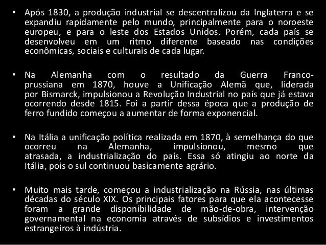 22. 22. • Após 1830, a produção industrial se descentralizou da Inglaterra e se expandiu rapidamente pelo mundo, principalmente para o noroeste europeu, e para o leste dos Estados Unidos. Porém, cada país se desenvolveu em um ritmo diferente baseado nas condições econômicas, sociais e culturais de cada lugar.• Na Alemanha com o resultado da Guerra Franco- prussiana em 1870, houve a Unificação Alemã que, liderada por Bismarck, impulsionou a Revolução Industrial no país que já estava ocorrendo desde 1815. Foi a partir dessa época que a produção de ferro fundido começou a aumentar de forma exponencial.• Na Itália a unificação política realizada em 1870, à semelhança do que ocorreu na Alemanha, impulsionou, mesmo que atrasada, a industrialização do país. Essa só atingiu ao norte da Itália, pois o sul continuou basicamente agrário.• Muito mais tarde, começou a industrialização na Rússia, nas últimas décadas do século XIX. Os principais fatores para que ela acontecesse foram a grande disponibilidade de mão-de-obra, intervenção governamental na economia através de subsídios e investimentos estrangeiros à indústria.