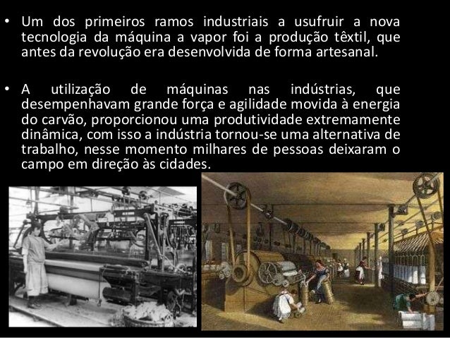5. 5. • Um dos primeiros ramos industriais a usufruir a nova tecnologia da máquina a vapor foi a produção têxtil, que antes da revolução era desenvolvida de forma artesanal.• A utilização de máquinas nas indústrias, que desempenhavam grande força e agilidade movida à energia do carvão, proporcionou uma produtividade extremamente dinâmica, com isso a indústria tornou-se uma alternativa de trabalho, nesse momento milhares de pessoas deixaram o campo em direção às cidades.