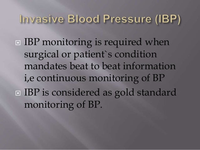 10. 10.  IBP monitoring is required when surgical or patient`s condition mandates beat to beat information i,e continuous monitoring of BP  IBP is considered as gold standard monitoring of BP.
