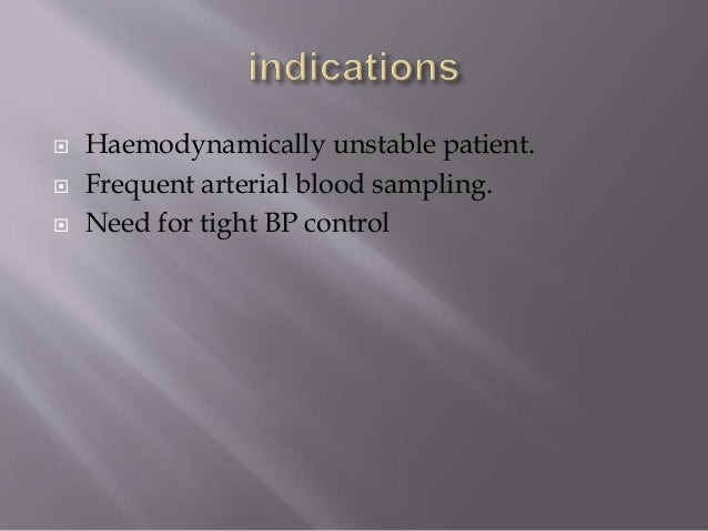 11. 11.  Haemodynamically unstable patient.  Frequent arterial blood sampling.  Need for tight BP control