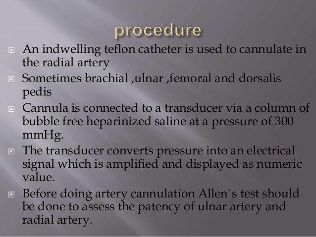 12. 12.  An indwelling teflon catheter is used to cannulate in the radial artery  Sometimes brachial ,ulnar ,femoral and dorsalis pedis  Cannula is connected to a transducer via a column of bubble free heparinized saline at a pressure of 300 mmHg.  The transducer converts pressure into an electrical signal which is amplified and displayed as numeric value.  Before doing artery cannulation Allen`s test should be done to assess the patency of ulnar artery and radial artery.