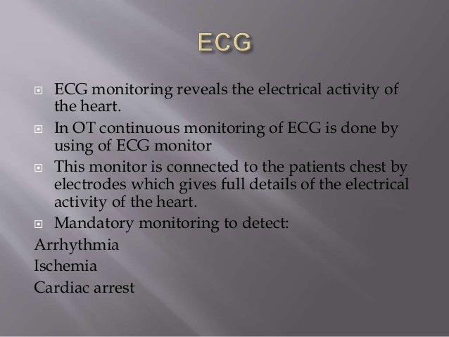 13. 13.  ECG monitoring reveals the electrical activity of the heart.  In OT continuous monitoring of ECG is done by using of ECG monitor  This monitor is connected to the patients chest by electrodes which gives full details of the electrical activity of the heart.  Mandatory monitoring to detect: Arrhythmia Ischemia Cardiac arrest