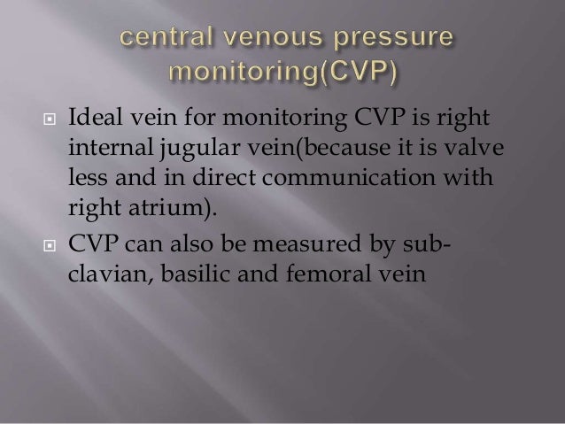 14. 14.  Ideal vein for monitoring CVP is right internal jugular vein(because it is valve less and in direct communication with right atrium).  CVP can also be measured by sub- clavian, basilic and femoral vein