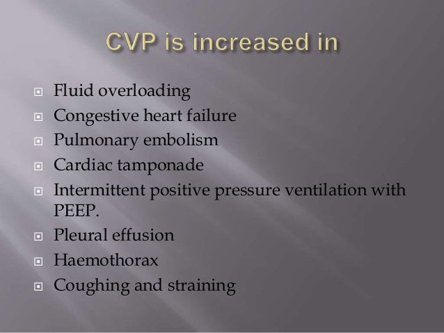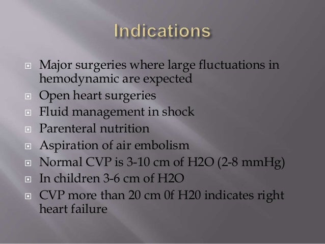 15. 15.  Major surgeries where large fluctuations in hemodynamic are expected  Open heart surgeries  Fluid management in shock  Parenteral nutrition  Aspiration of air embolism  Normal CVP is 3-10 cm of H2O (2-8 mmHg)  In children 3-6 cm of H2O  CVP more than 20 cm 0f H20 indicates right heart failure