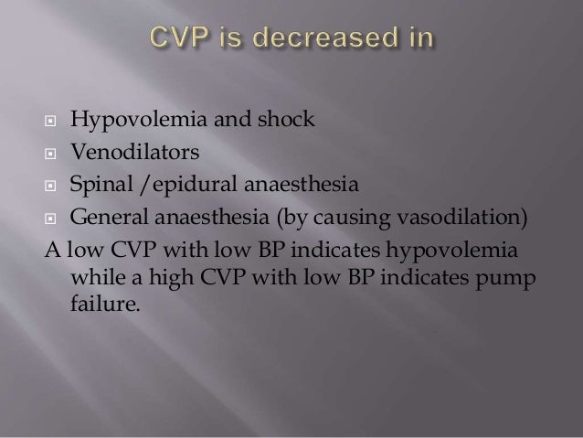 17. 17.  Hypovolemia and shock  Venodilators  Spinal /epidural anaesthesia  General anaesthesia (by causing vasodilation) A low CVP with low BP indicates hypovolemia while a high CVP with low BP indicates pump failure.