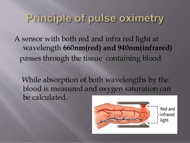 19. 19. A sensor with both red and infra red light at wavelength 660nm(red) and 940nm(infrared) passes through the tissue containing blood While absorption of both wavelengths by the blood is measured and oxygen saturation can be calculated.