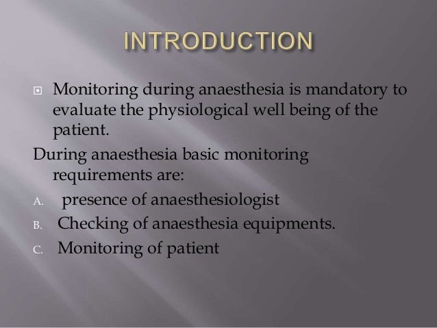 2. 2.  Monitoring during anaesthesia is mandatory to evaluate the physiological well being of the patient. During anaesthesia basic monitoring requirements are: A. presence of anaesthesiologist B. Checking of anaesthesia equipments. C. Monitoring of patient